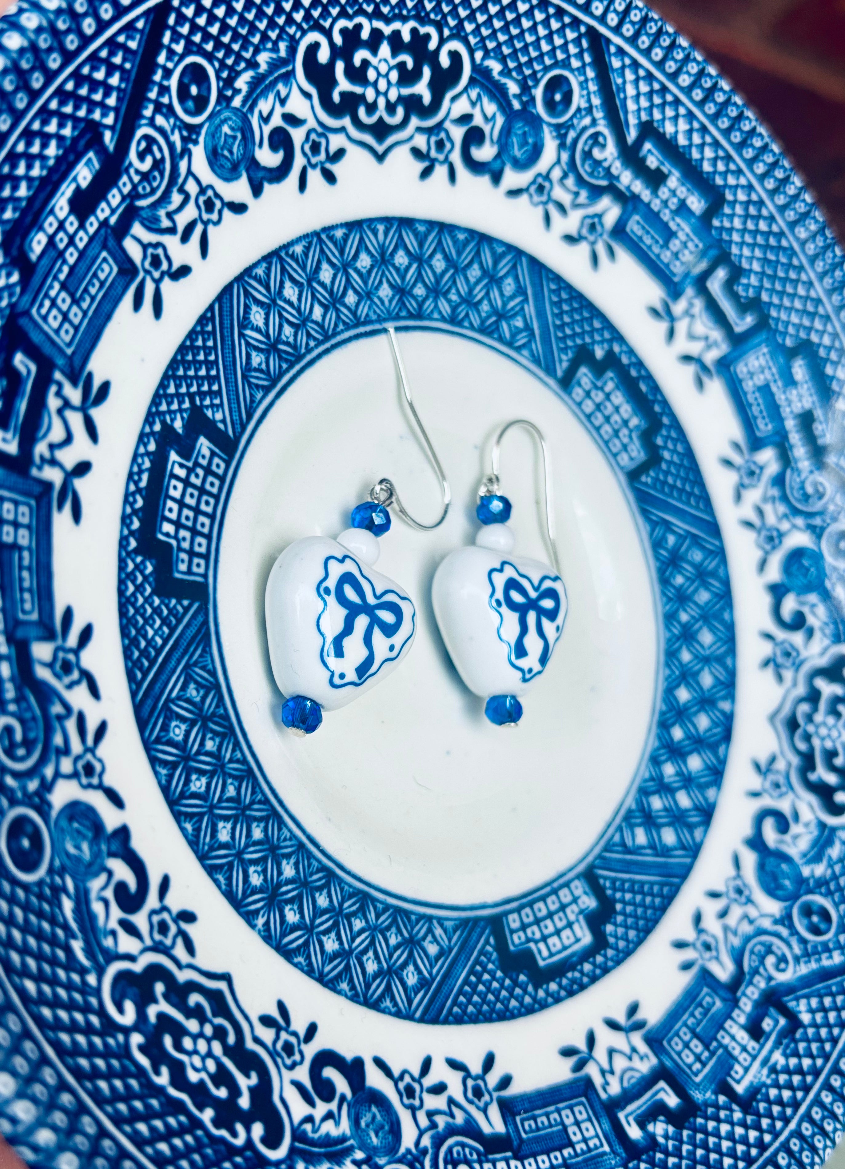 These porcelain blue bow hearts are adorable!! I have paired them with some 1930s milk glass and some gorgeous blue crystals.