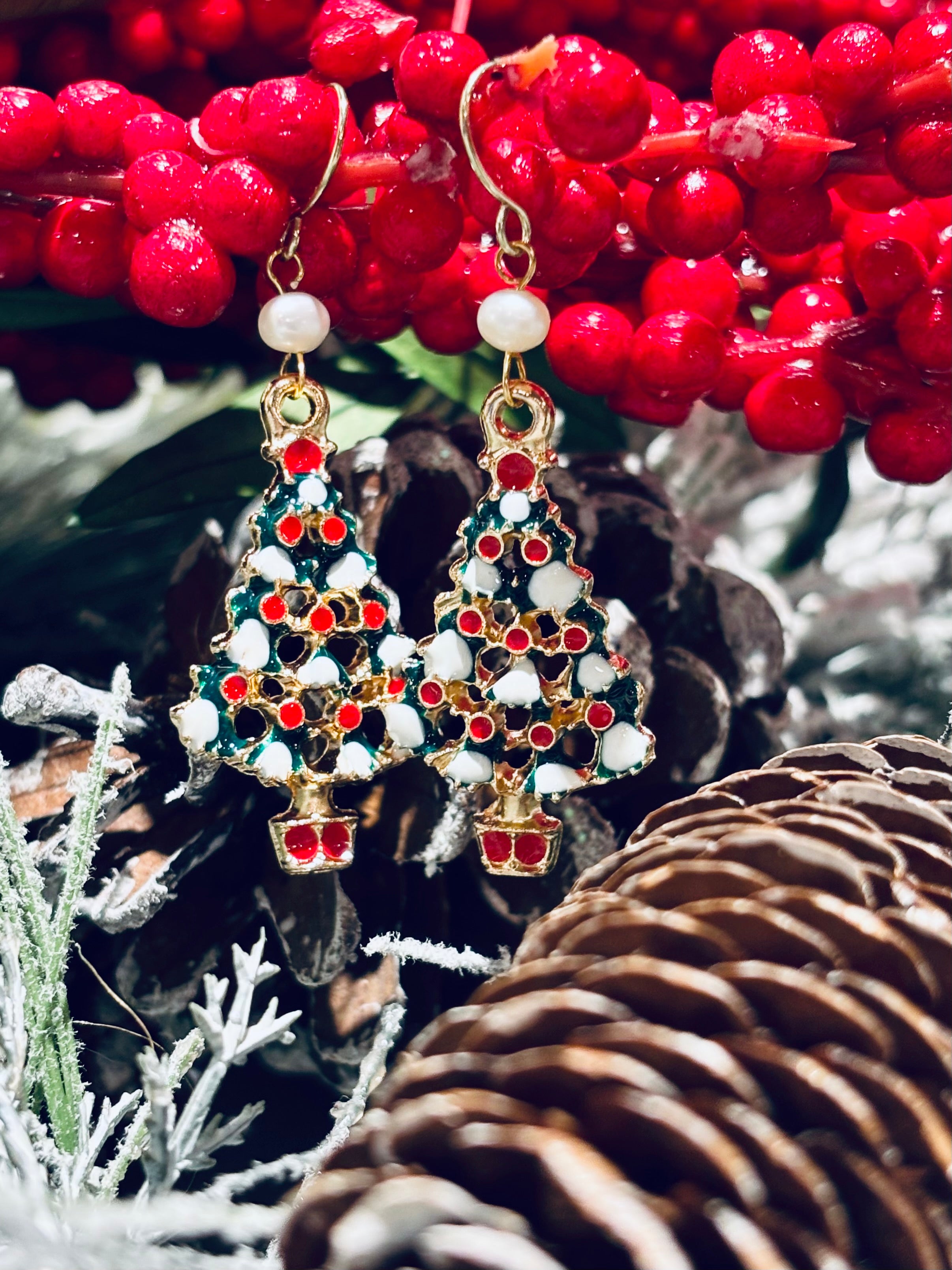 These O Tannenbaum flocked Christmas tree earrings are adorned with golden enamel and paired with a white freshwater pearl for a classic holiday look. The perfect blend of red and green adds just the right touch of festive cheer to any outfit.