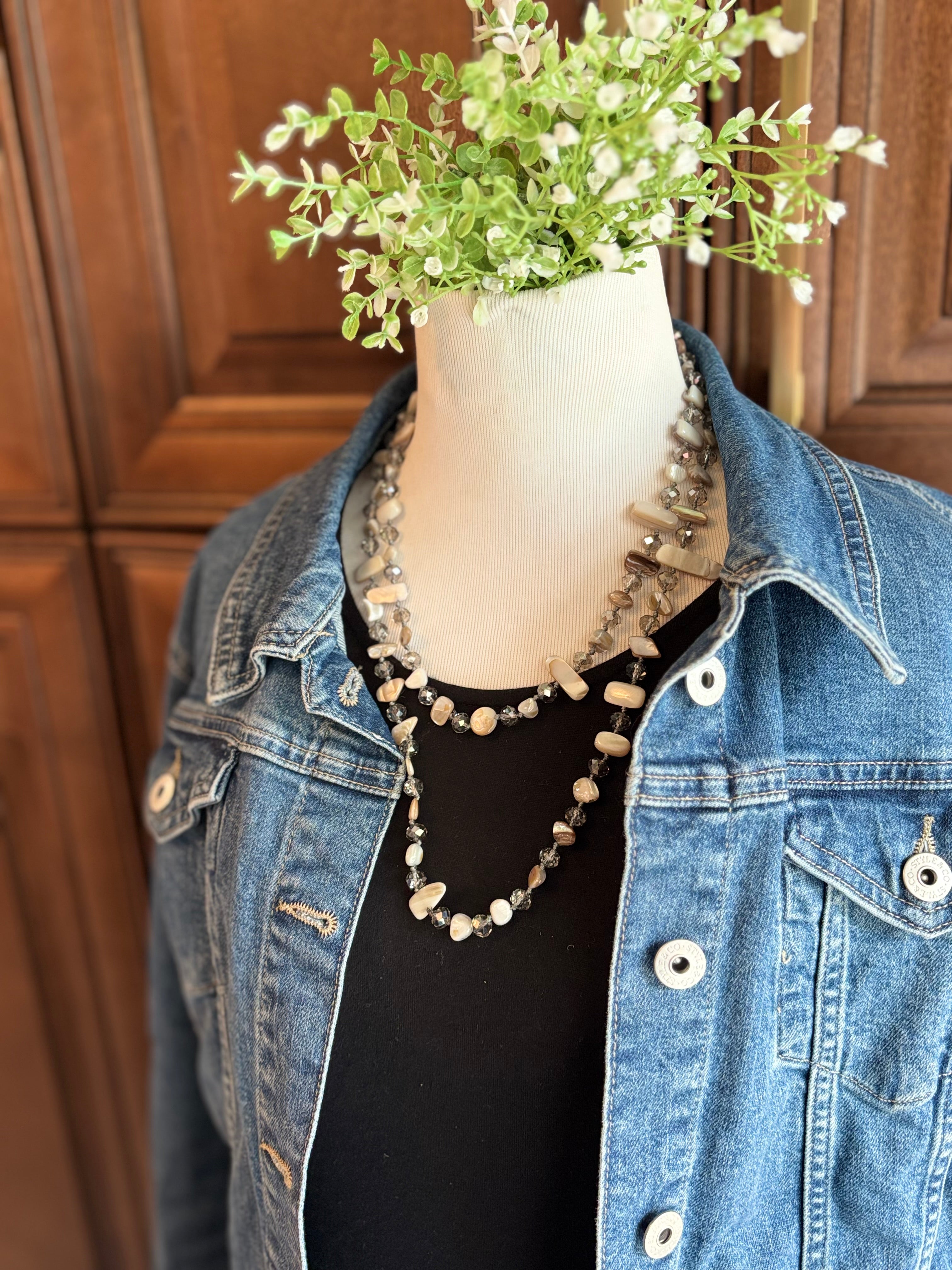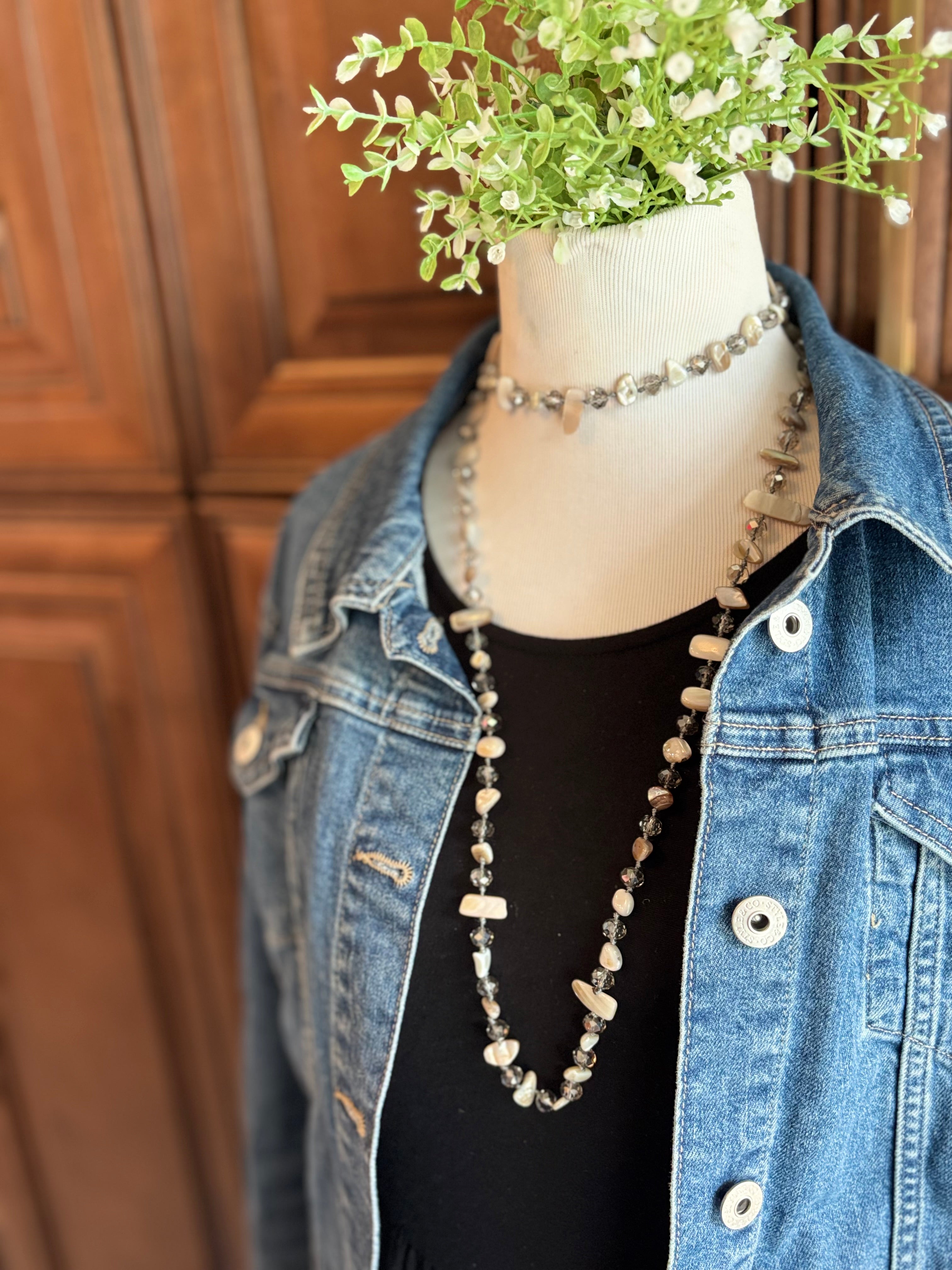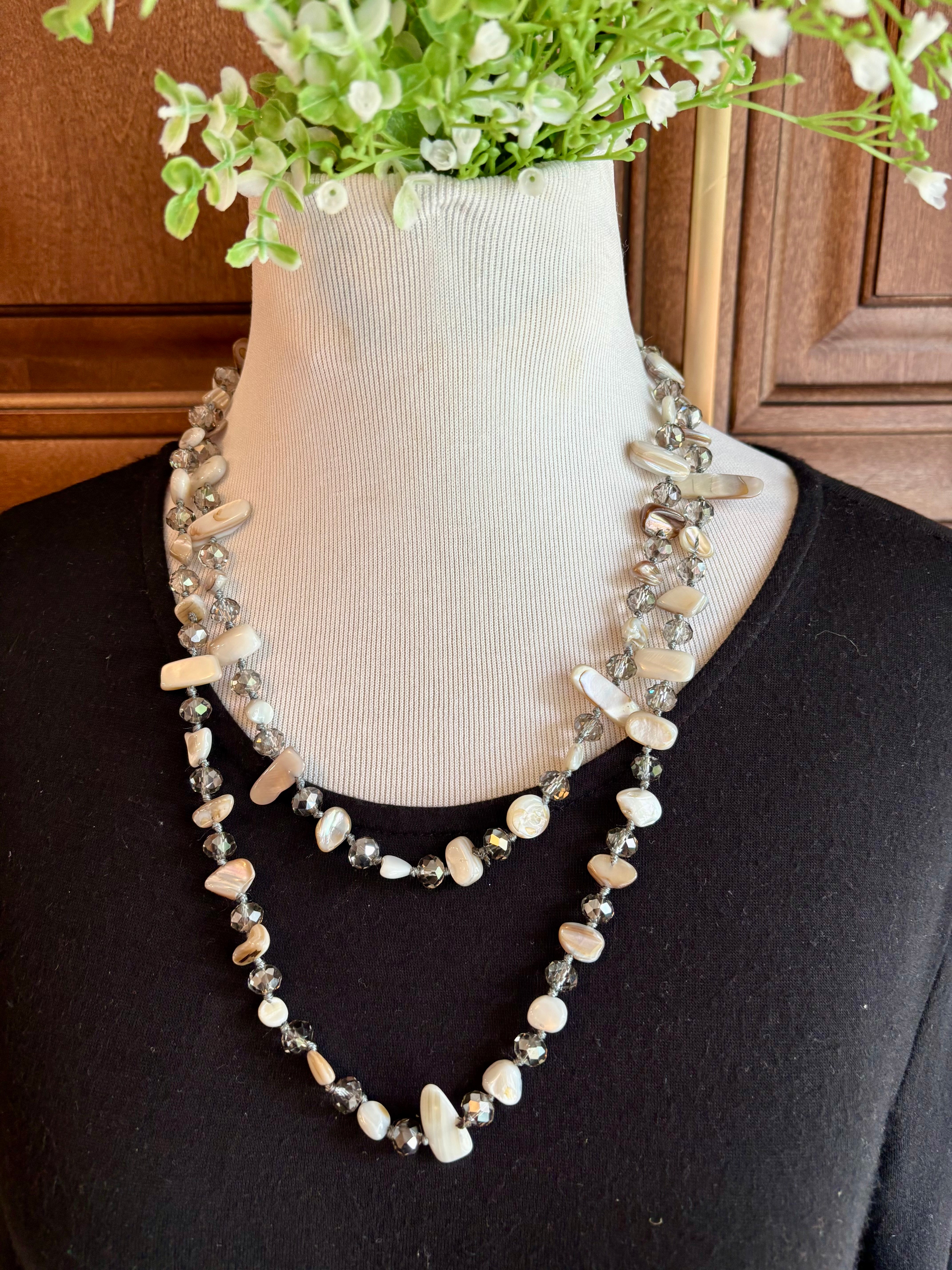 This 48 inch necklace is made with silver mother of pearl and crystals. It is a beautiful addition to your accessory selection! as a neutral, you can wear it with almost anything! You can wear it long, doubled, or knotted.