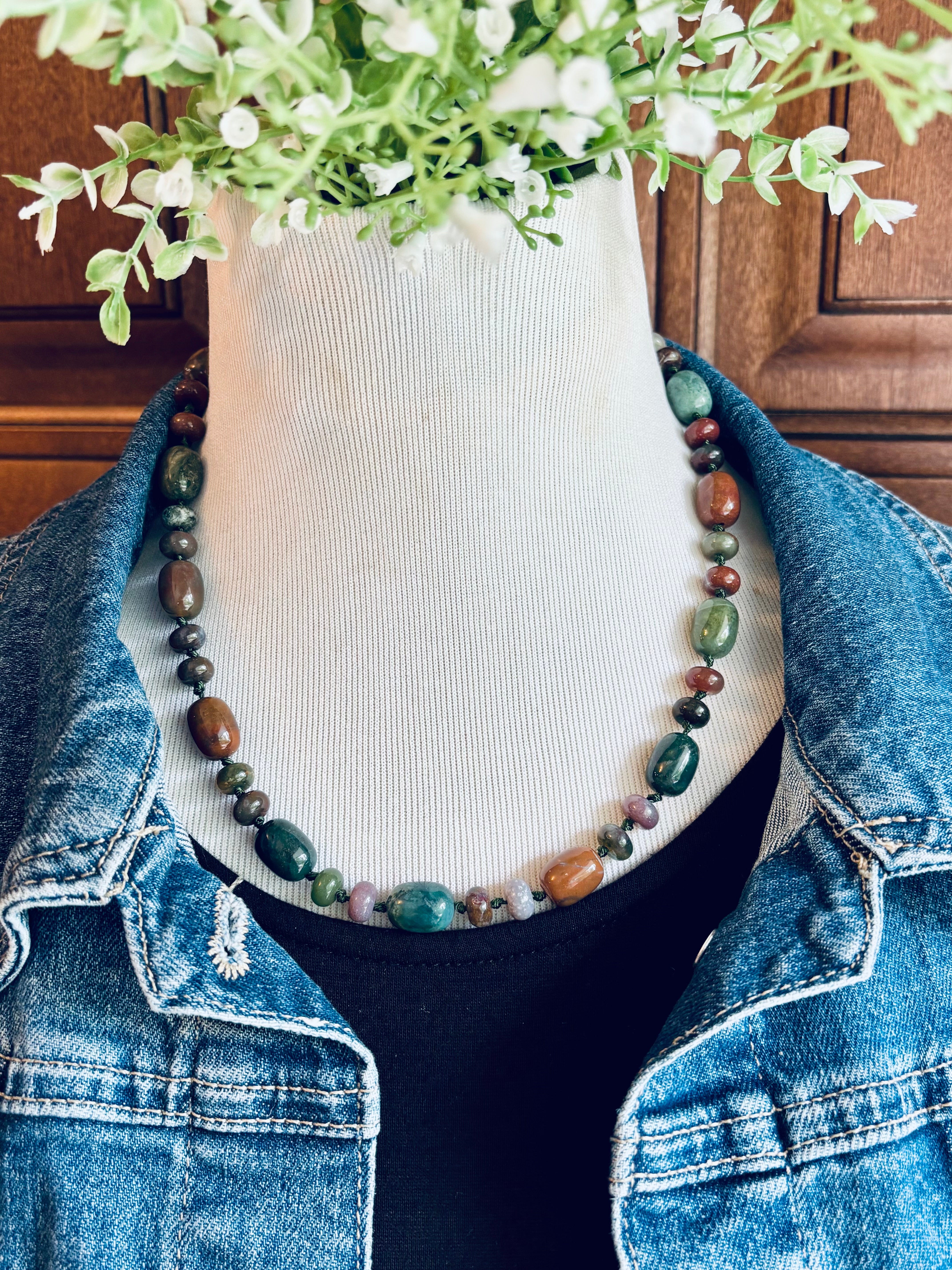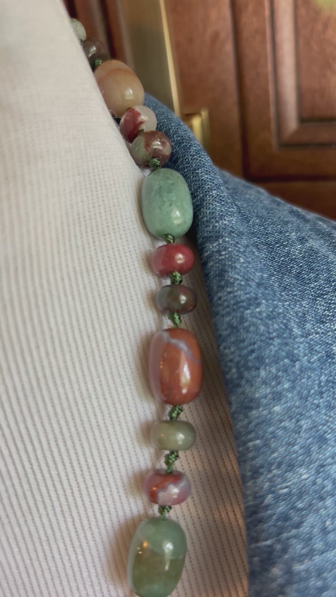 The Celeste necklace is mixture of beautiful malachite, lapis, and agate stones knotted together to make this scrumptious piece. No two of these necklaces are the same! She is 18 inches long. The warm tones are perfet for fall!