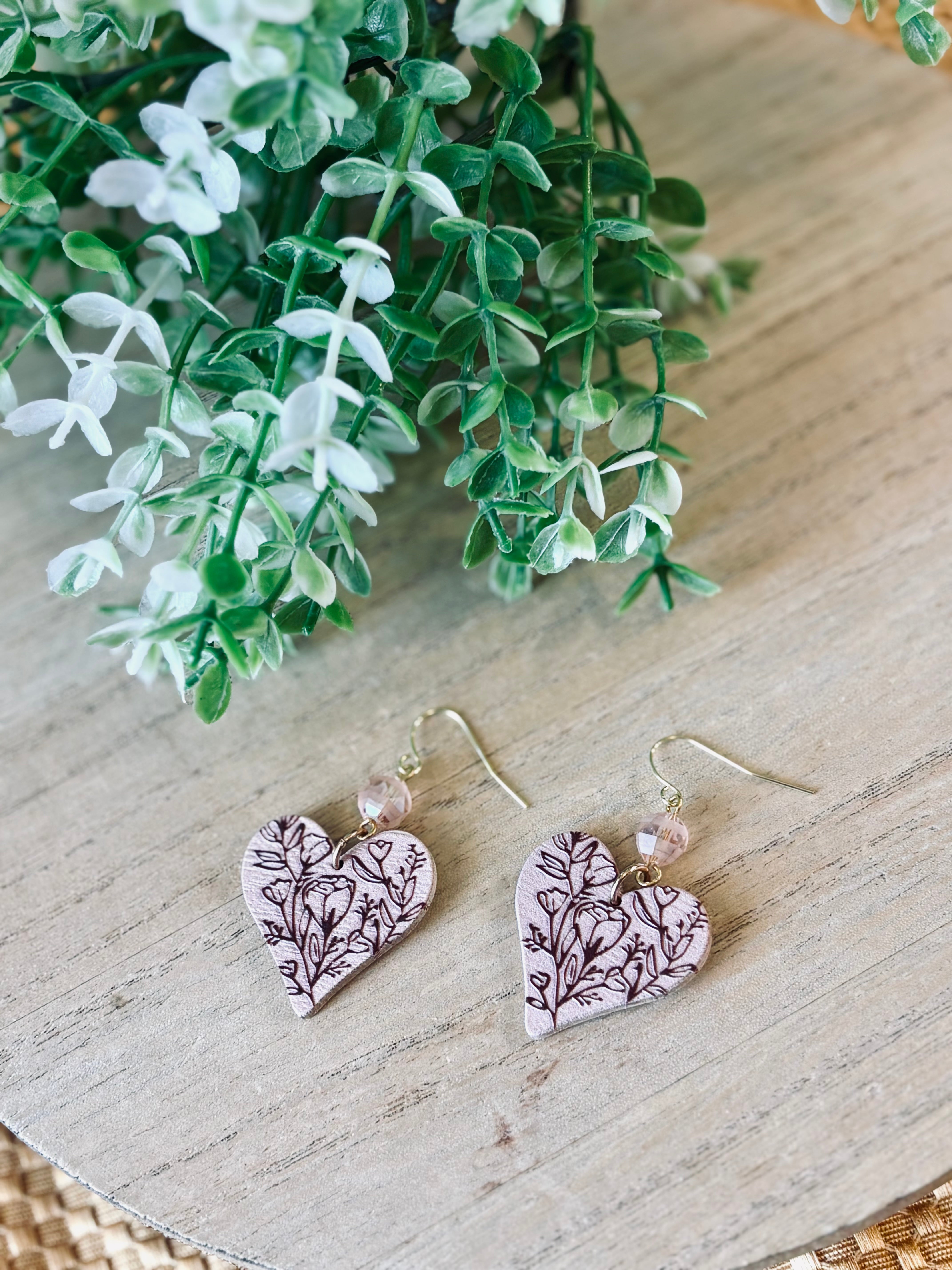 Wooden hearts with a burned floral motif and rose gold crystal accent.