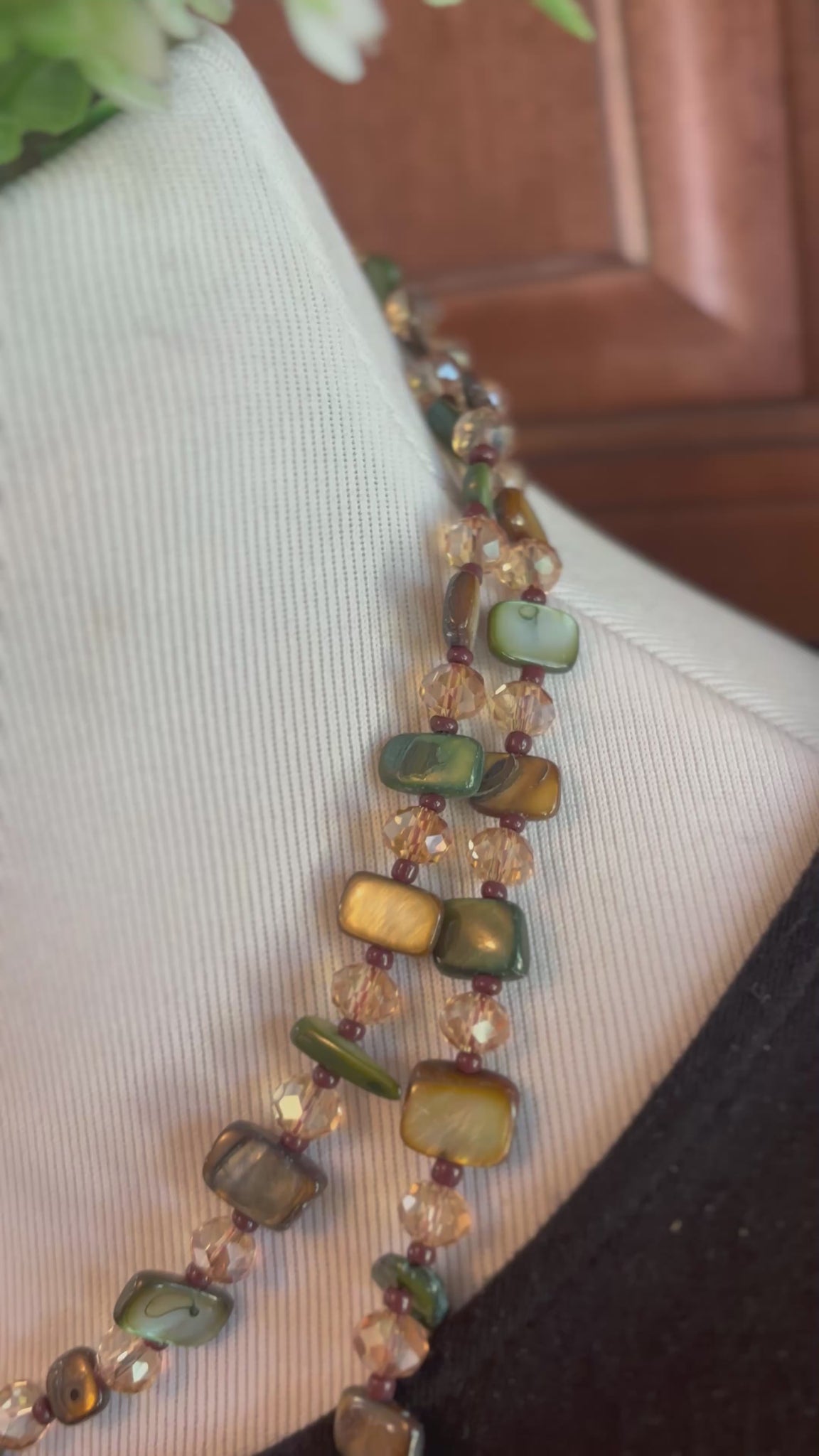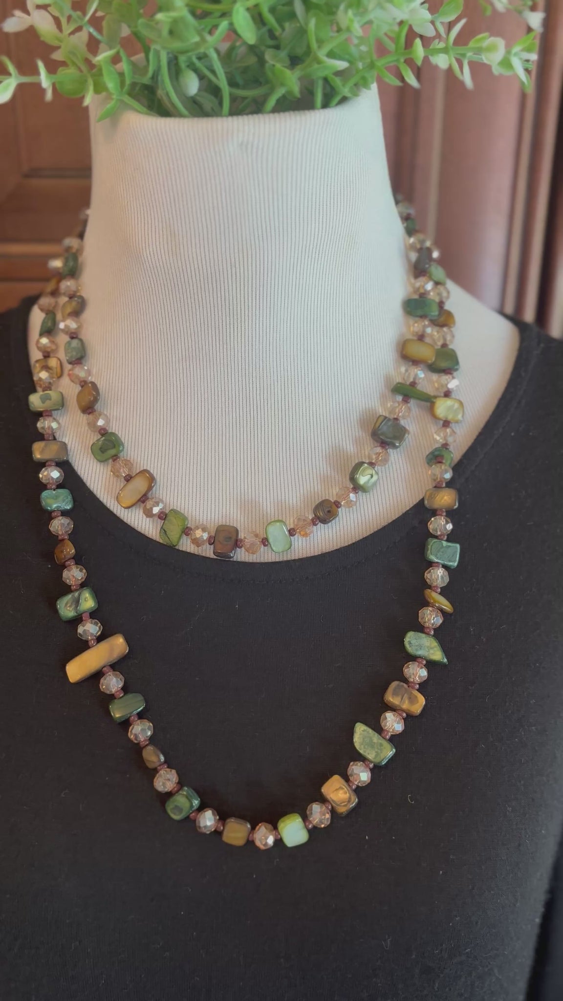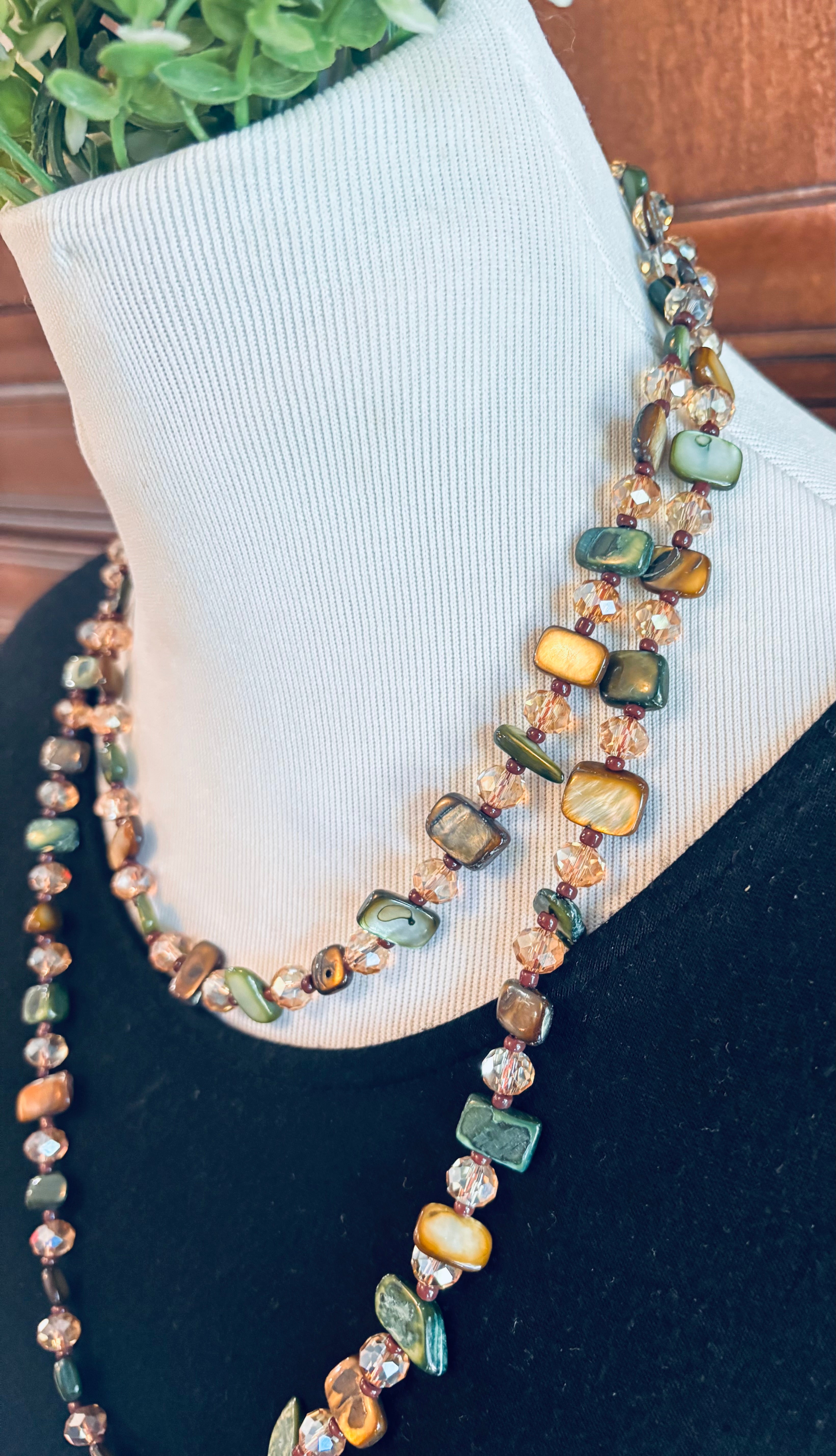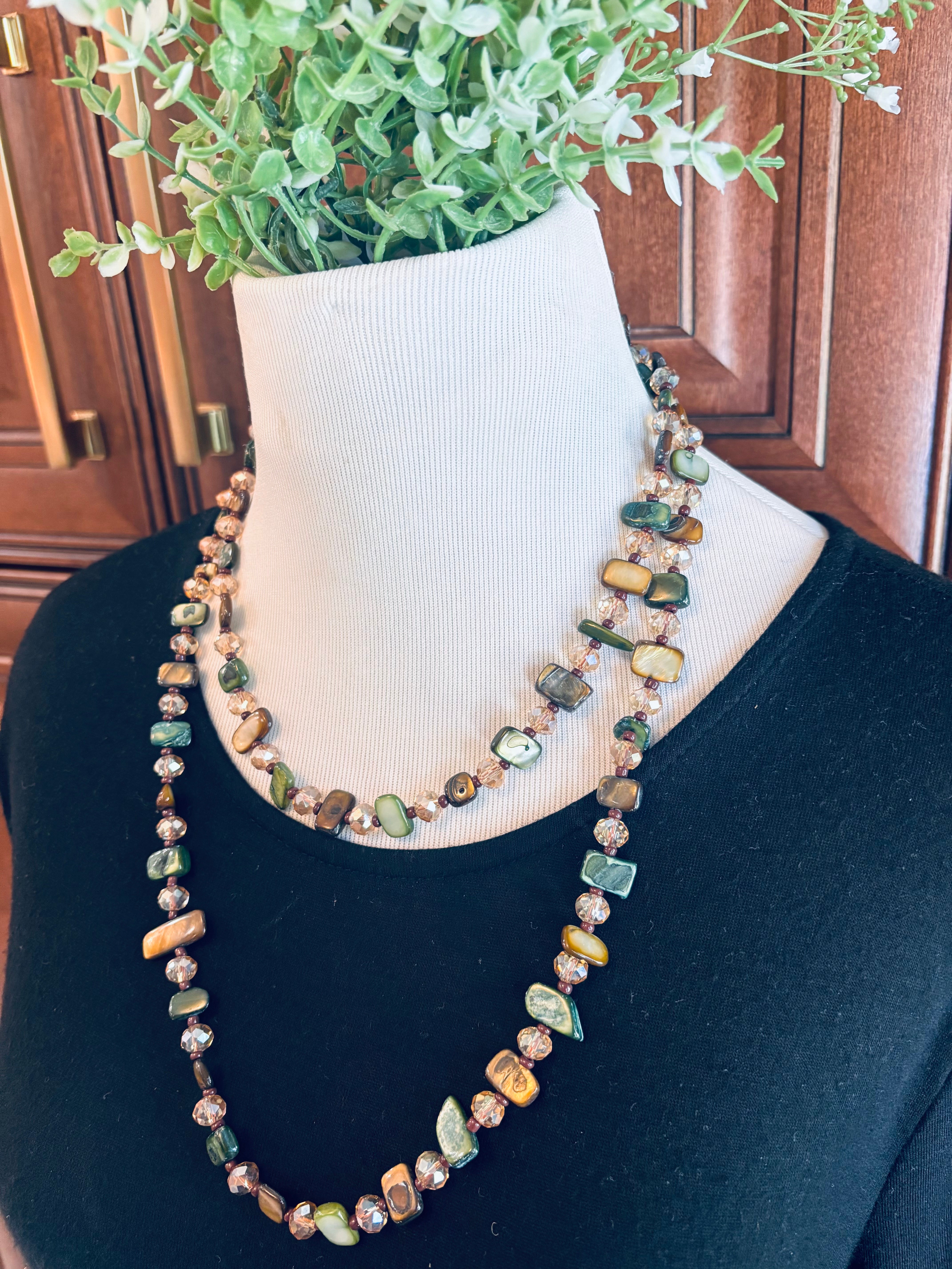 This 48 inch necklace is made with green and brown mother of pearl and warm crystals. It is a beautiful addition to your fall accessory selection! You can wear it long, doubled, or knotted.