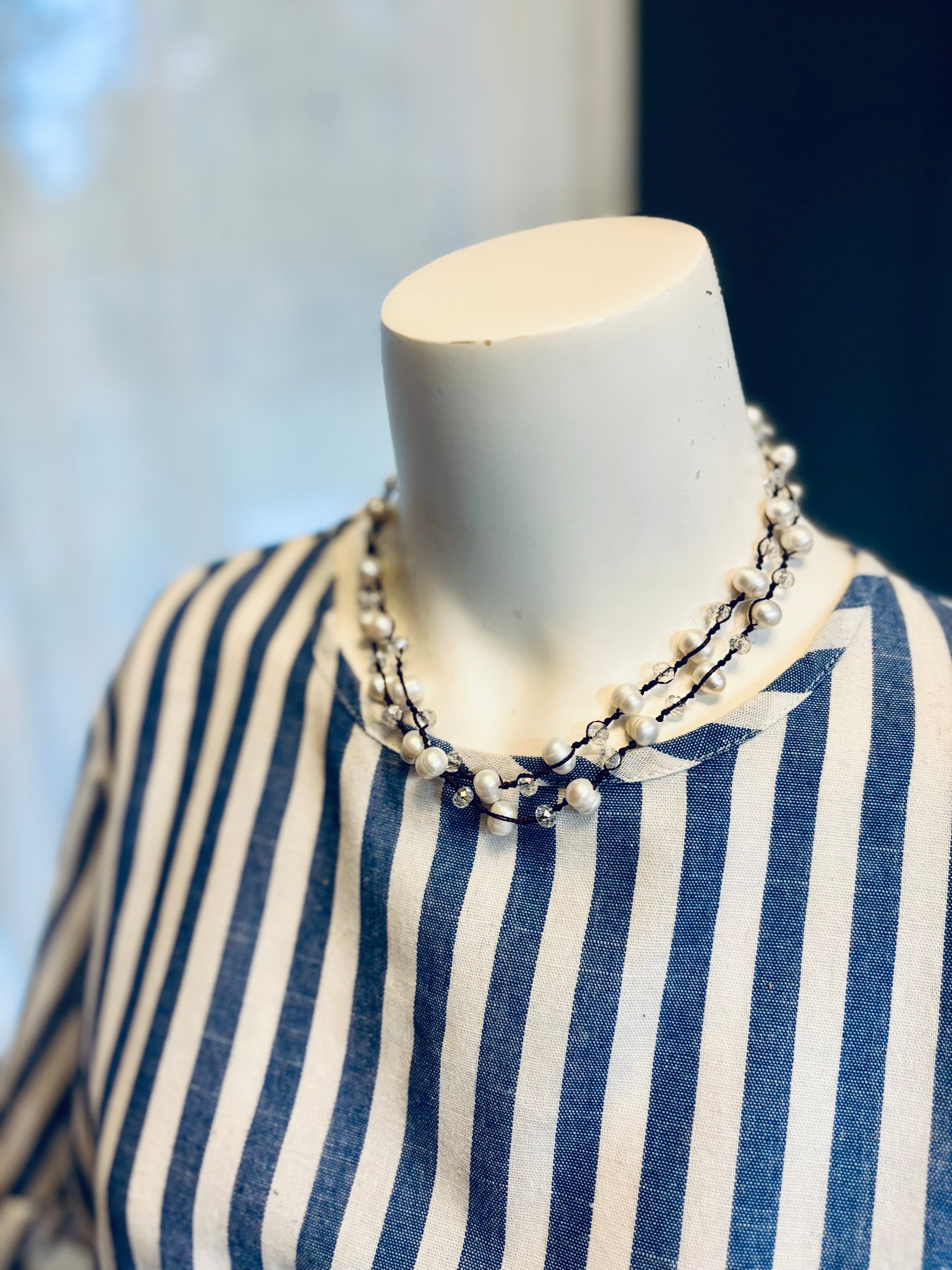The Kendra necklace is perfect for a more casual outfit! She has fabulous texture with her knots, pearls, and crystals.