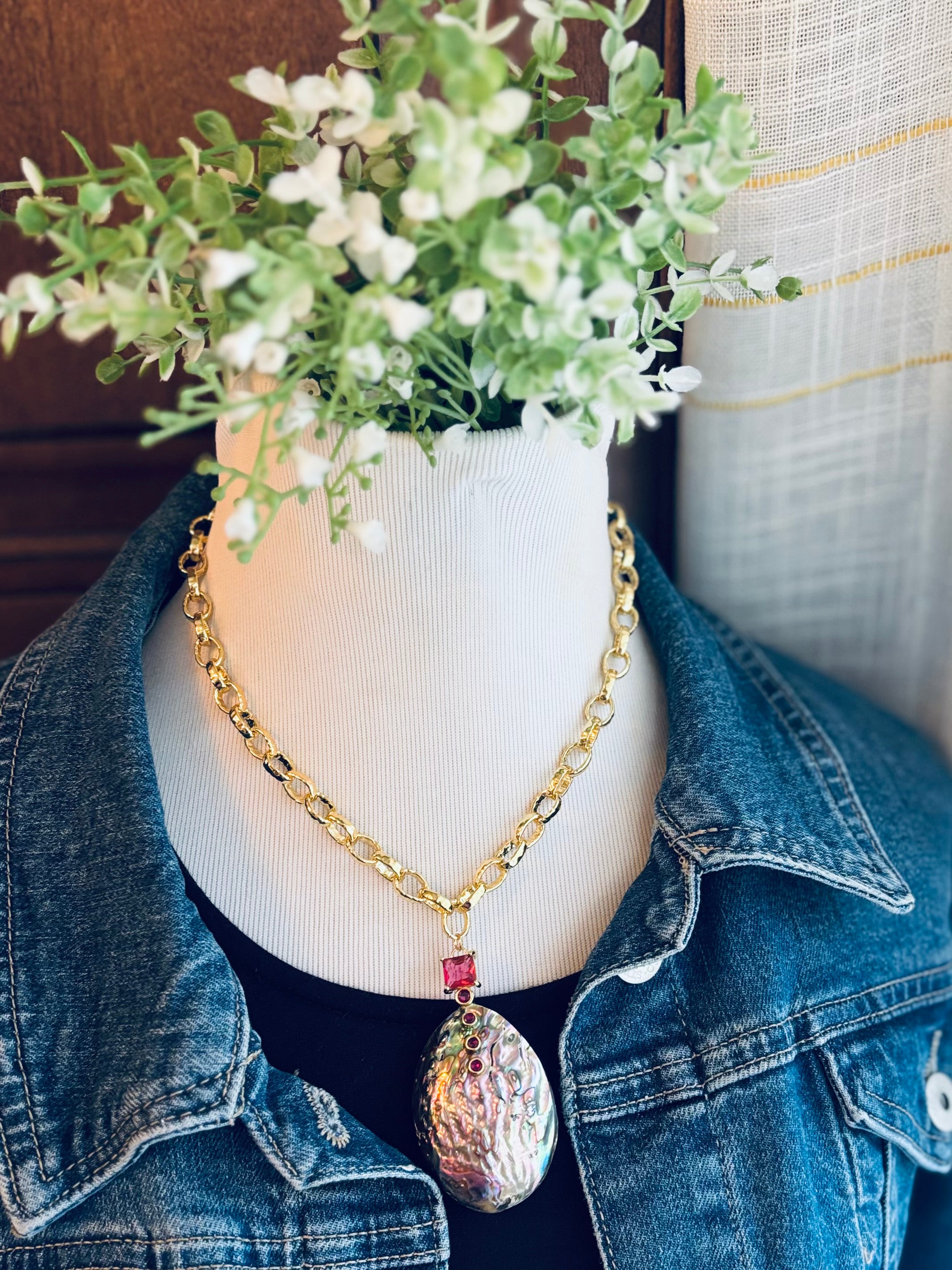 Discover the chic elegance of The Krista Necklace. Adorned with an abalone and cranberry cubic zirconia pendant, this necklace is the perfect accessory for any occasion. The golden paper clip chain adds a touch of sophistication, completing the exquisite design. Elevate your style and make a statement with this stunning piece. She is 17 inches in length but also has an extender.