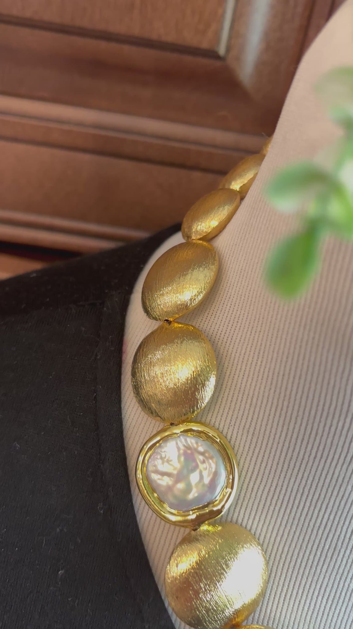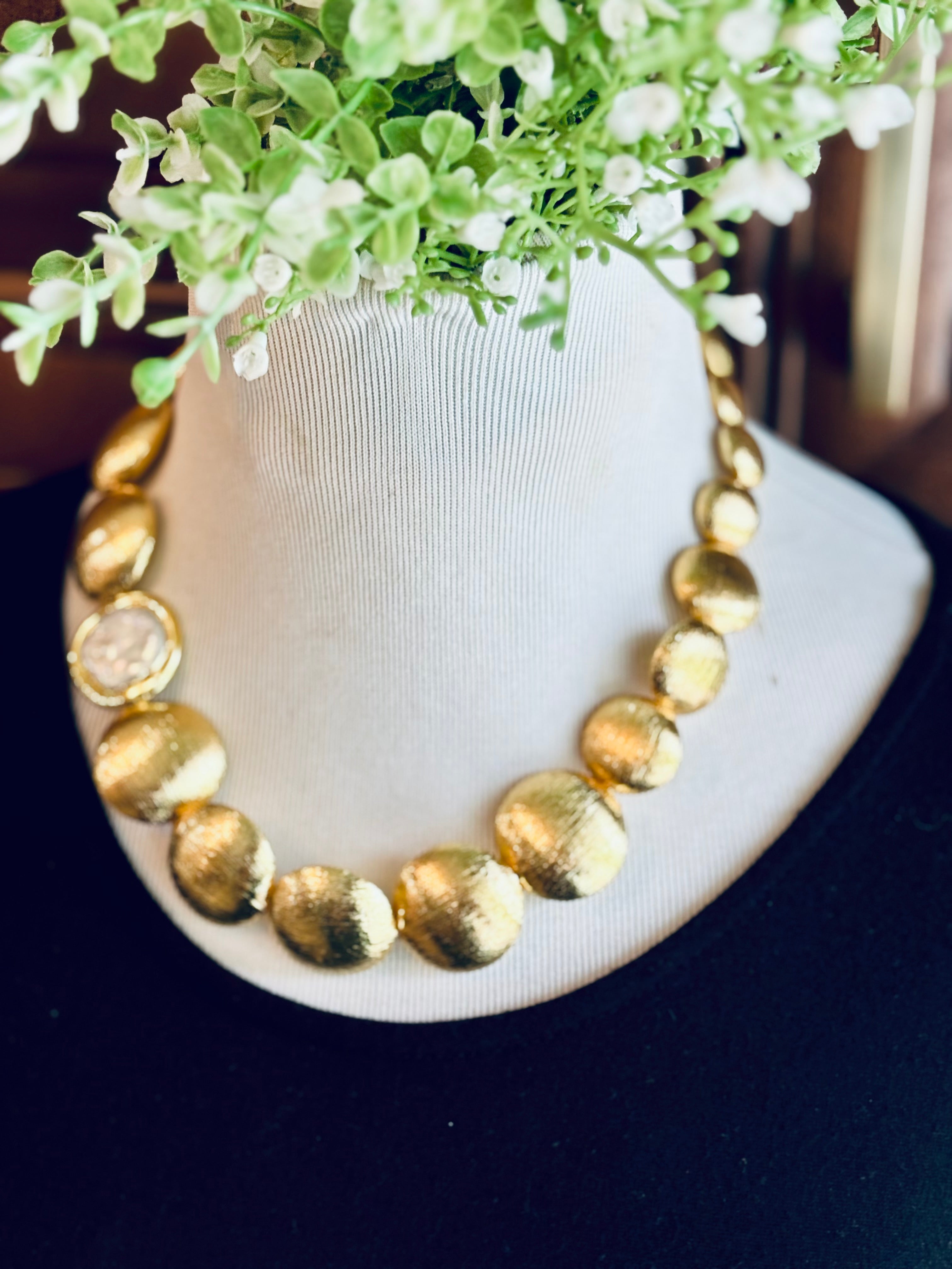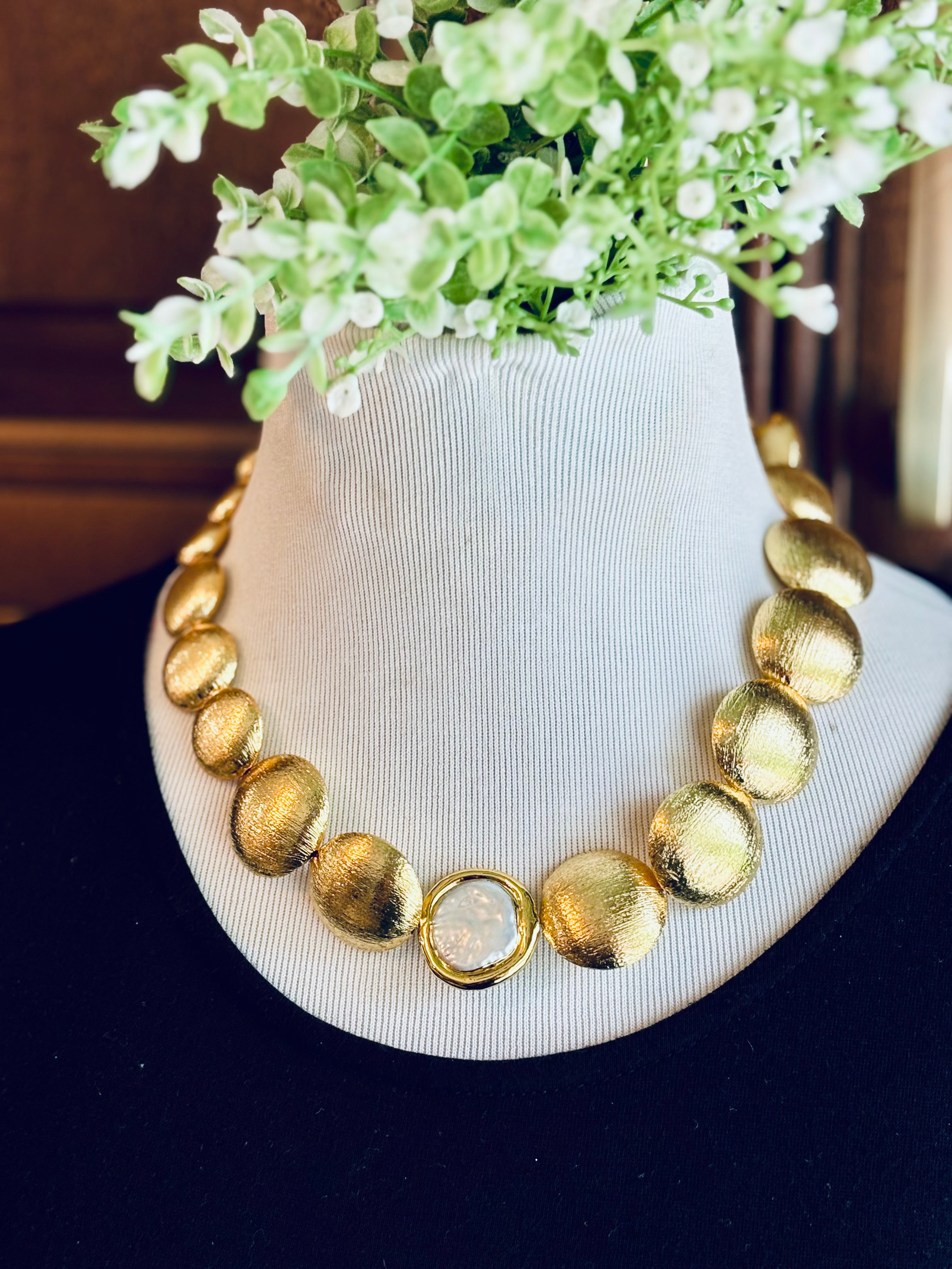 This chic necklace is made with graduated brushed gold beads with a coin pearl accent. She’s perfect for year round elegance . At 18 inches with an adjustable length, she is perfect for wearing even with a collared shirt.